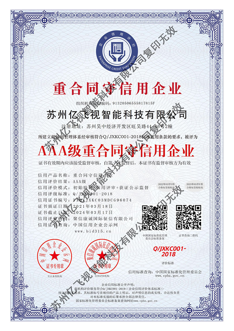 喜報!喜報!2021年,在這春暖花開的季節(jié),蘇州億飛視智能科技有限公司獲得“AAA重合同守信用企業(yè)”證書!公司經(jīng)過十多年的誠信經(jīng)營,所做項目全部得到業(yè)主使用單位的好評;所有供應商和合作伙伴均對公司給出高度評價。